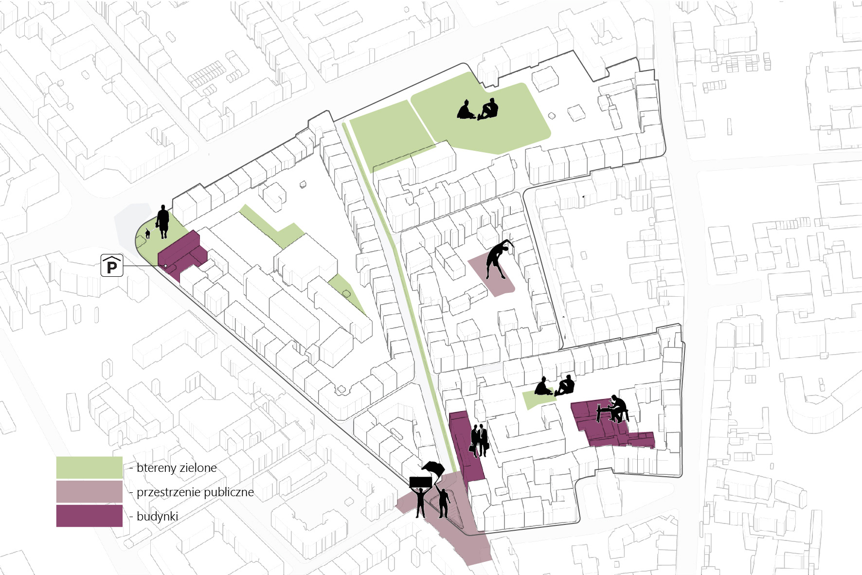 An important role in the process of activating the square should be played by a new building located in the space between the residential buildings facing the square. Previously, this place housed buildings that formed the quarter, but after its demolition in 2WW, the site was used as a kurdoner, or car parking.