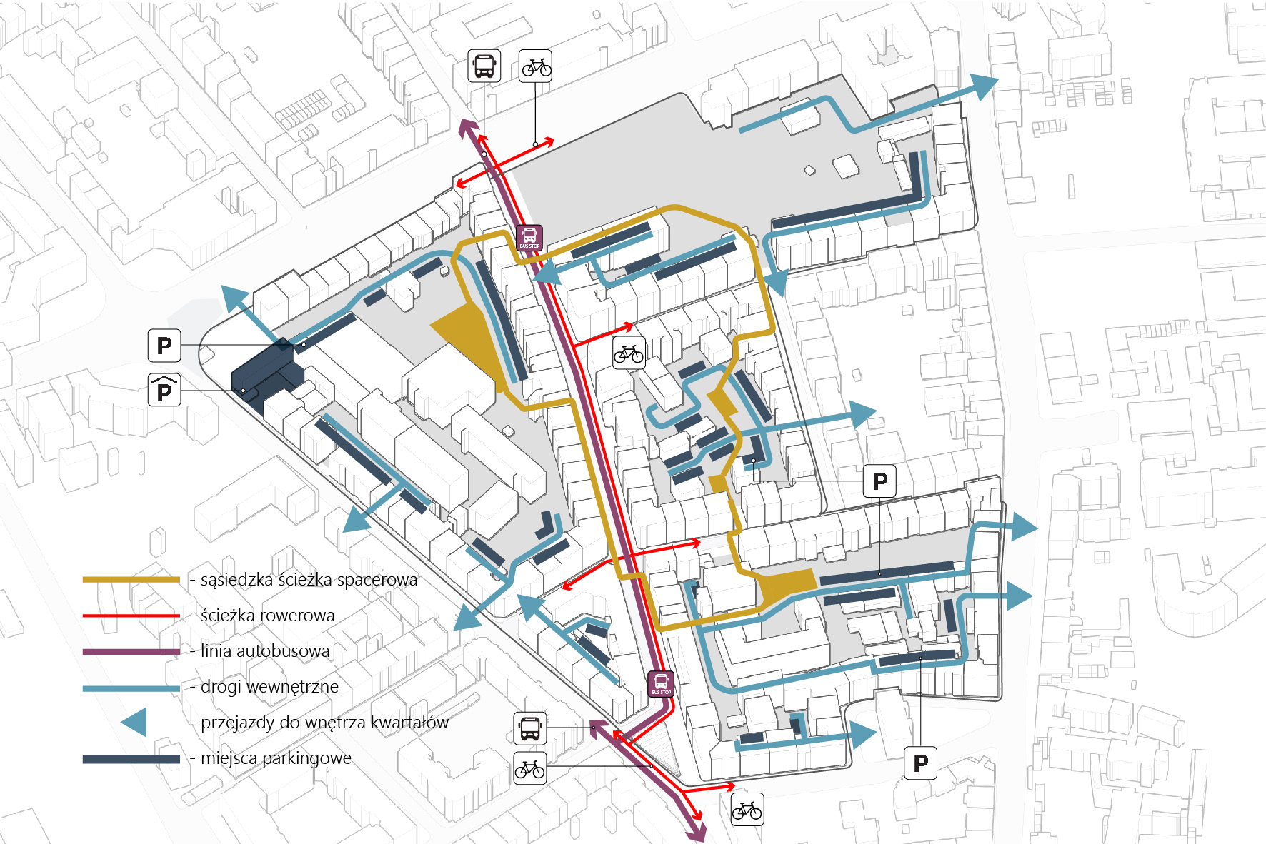 An important addition to the system of courtyard spaces activation is the "happy neighbor way", which connects residential areas around the Paris Commune str. . The path uses open areas and passages that connect the still separated quarters. Through trails of activity on the trail, residents visit each other using complementary infrastructure. Such decisions are aimed to create more friendly neighborhood community across the street.