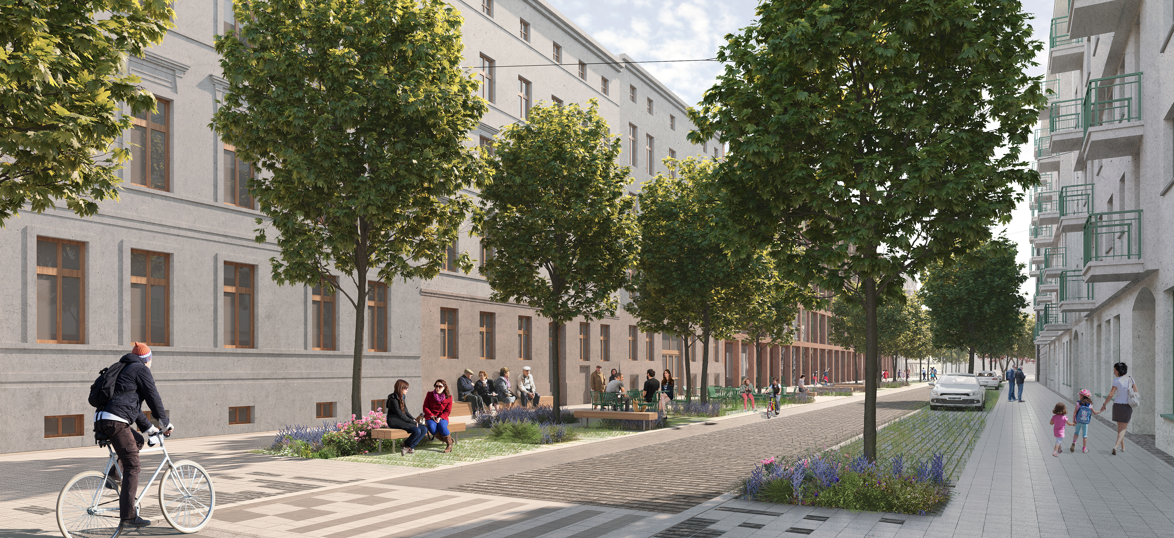 In addition to its main communicative role, the street should become an attractive public space for residents of neighboring houses. In the case of the street, it was decided to use economic ways of expression, respecting the nature of historic buildings of the nineteenth century. On part of the roadway was preserved historic cobblestones, which will be used for paving sidewalks and part of the bike path. Parking lots and green strips are covered with water-absorbing eco-paving, which allows to create a complex drainage system with closed holding tanks with the function of a rainwater filter for the possibility of its use for irrigation. Excess water in this case can be discharged into the main tank located in the pocket park. The green belt along the street has a varied character, with fragments of water-absorbing paving and lush greenery, creating pockets with benches for relaxation, or places of potential summer extensions for cafes. Landscaping is complemented by tall plantations located along the lane and between parking lots. As a result, the space is open to a variety of uses, including the possibility of eliminating parking spaces in the future or temporarily blocking them. Street lighting consists of pendant lights in the form of rings.
