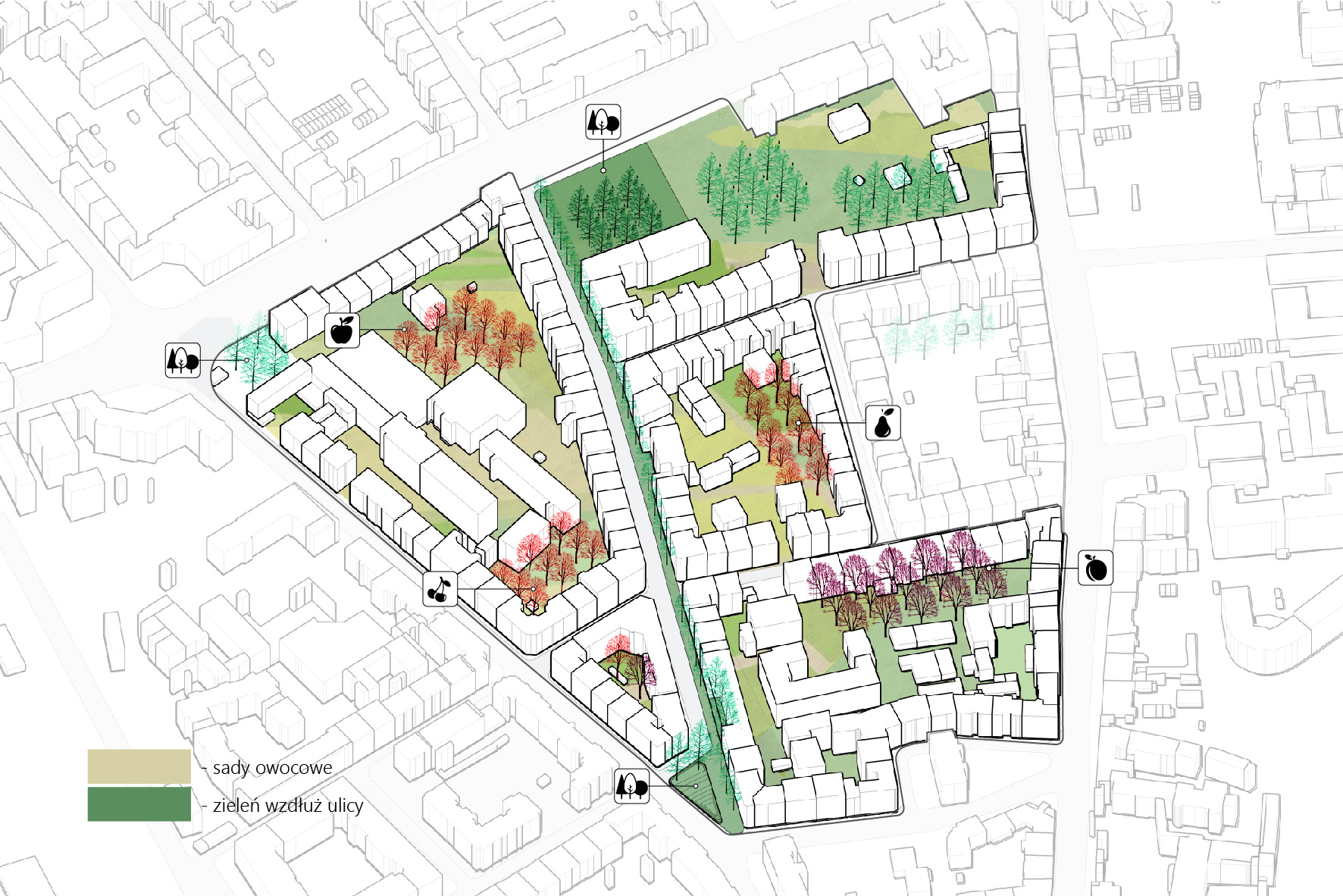 Кожному внутрішньодворовому простору надано індивідуальне естетичне вираження через розсадження фруктових садів: яблуко, грушу та вишню. Сади підкреслюють ідентичність кожного кварталу та роблять прогулянку по "Тропі добросусідства" більш привабливою.