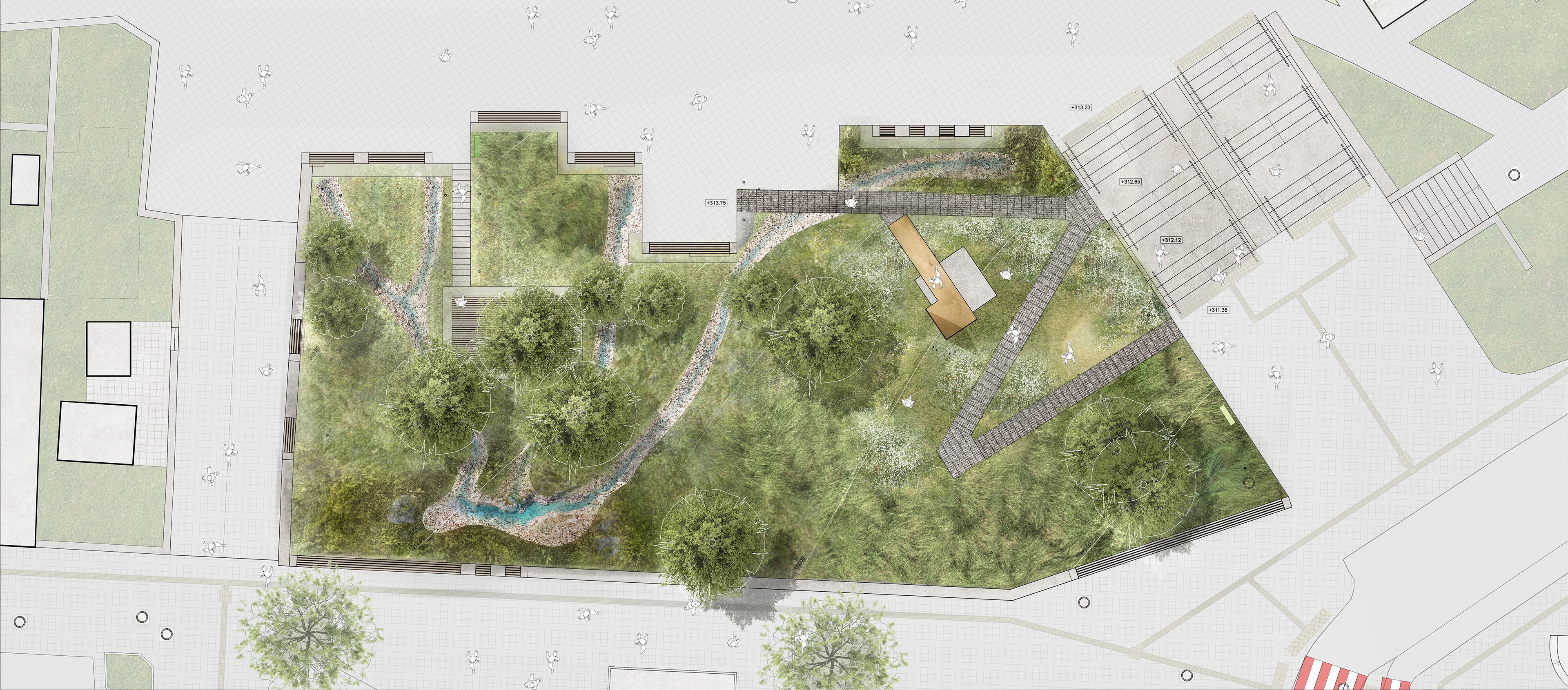 It relies on already existing trees that grow more densely in the left part of the site. A dense planting of plants that would create an undergrowth is proposed here. In this zone, there are plants that grow well in the shade.