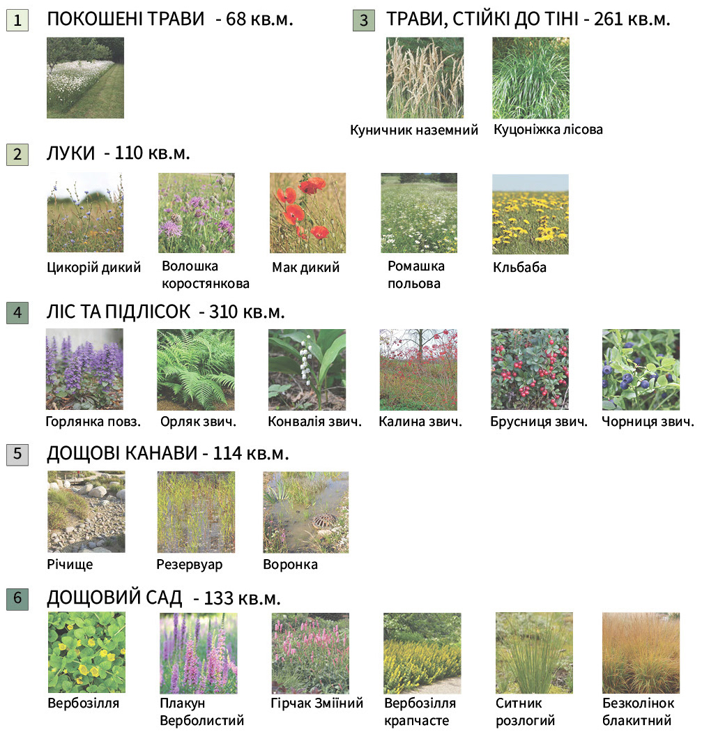 The proposed compositions are selected using the geobotanical approach in landscape design and imitate the composition and structure of natural phytocenoses characteristic of Ukrainian vegetation.
