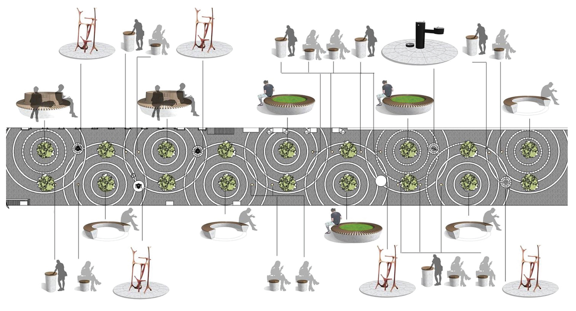 The aim of the project was to create separate chamber zones for individual needs and functions, thereby forming a certain corridor of their personal and public spaces, the pedestrians themselves becoming moderators. The main emphasis focuses on the graphic quality paving streets. The proposal provides for raising the plane of the street to the level of the pavement, thereby uniting and expanding the area for the pedestrian zone. Free space without fences creates a feeling of constant dynamics of movement and the absence of backstage chamber spaces, every corner of the street is in attention, there are no dead and inactive zones.