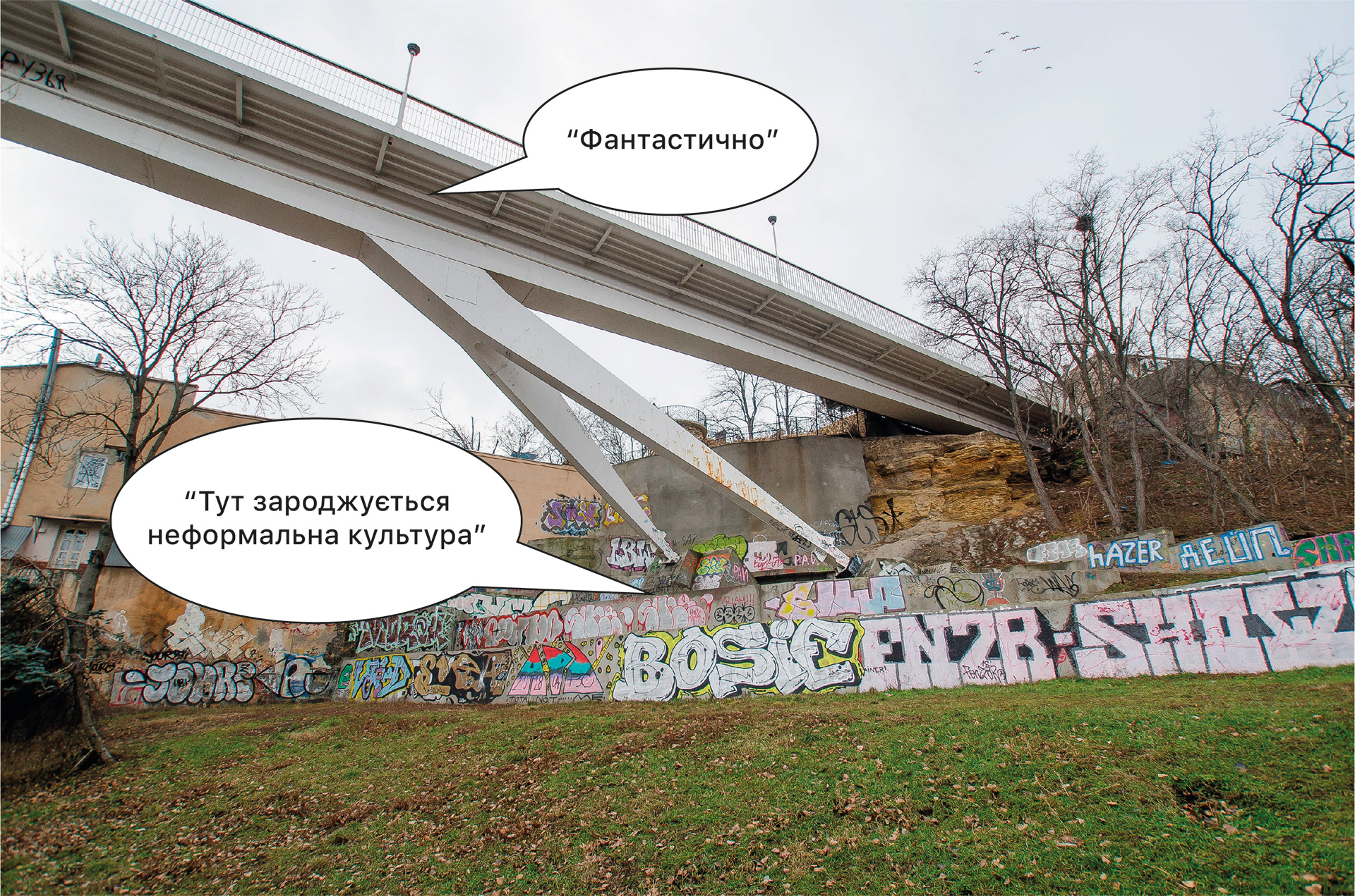 Youth Square - rebel space for extreme and counterculture. In the area's programming, we do not deny that the park will continue to be the site of a gathering of informal youth - we only arrange local practices. There will be an area, a skate park and wooden stairs for sitting, where young people will feel free. Under Teschin bridge there is a space for graffiti. One of the scenarios of the event is to hold an urban competition for the best graffiti.