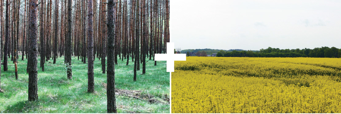 The selection of different levels of landscaping, including trees, refers to species specific to the Mazovia region. The reservoir in the forest landscape symbolizes lakes and wetlands, which are also characteristic of the northern part of the lowlands.
