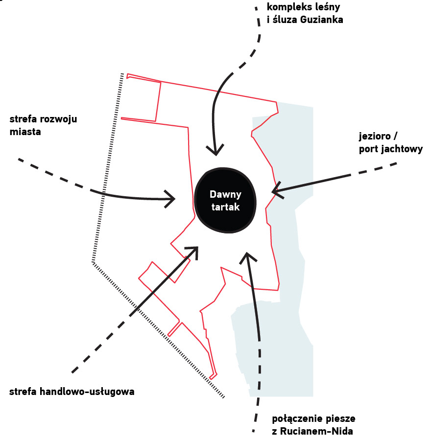 Основне завдання проєкту — створення нової, багатофункціональної міської зони, яка повністю використовує унікальний ландшафт місцевості. Руціане-Ніда, як молоде місто, не має історично розвиненого місця зустріч та подій. Головна транзитна артерія міста, по якій зараз зосереджена більшість функцій, на жаль, не виконує сьогодні цю функцію. Проєкт створює абсолютно новий громадський простір серед руїн постіндустріального символу міста — колишнього лісопильного заводу. Нова міська площа має нагадувати обриси лісопильного цеху та зосереджувати функції, повʼязані з обслуговуванням громадських потреб та водного туризму.