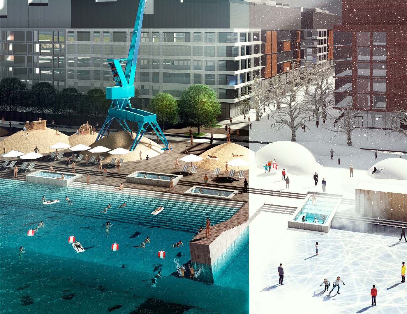 Канал є життєутворюючим елементом півострова. Наявність води треба підкреслити. Ми створюємо різноманітні елементи вуличного дизайну, які спонукають до дій, до знайомства з Дніпром. Так, посередині кварталу пропонуємо встановити гідравлічні платформи-острови. Вони будуть одночасно відображенням гри й ризику. Можна перейти на інший бік, начебто нічого не загрожує; а можна й не робити цього. Бажання перетнути вироблятиме адреналін та посмішку у тих, хто сміливіший за інших. Гідравлічні платформи можуть підійматися на різну висоту. Взимку це можна використовувати для спуску на замерзлий канал для ковзання по ньому. Платформа може зануритися під час навігації катерів.