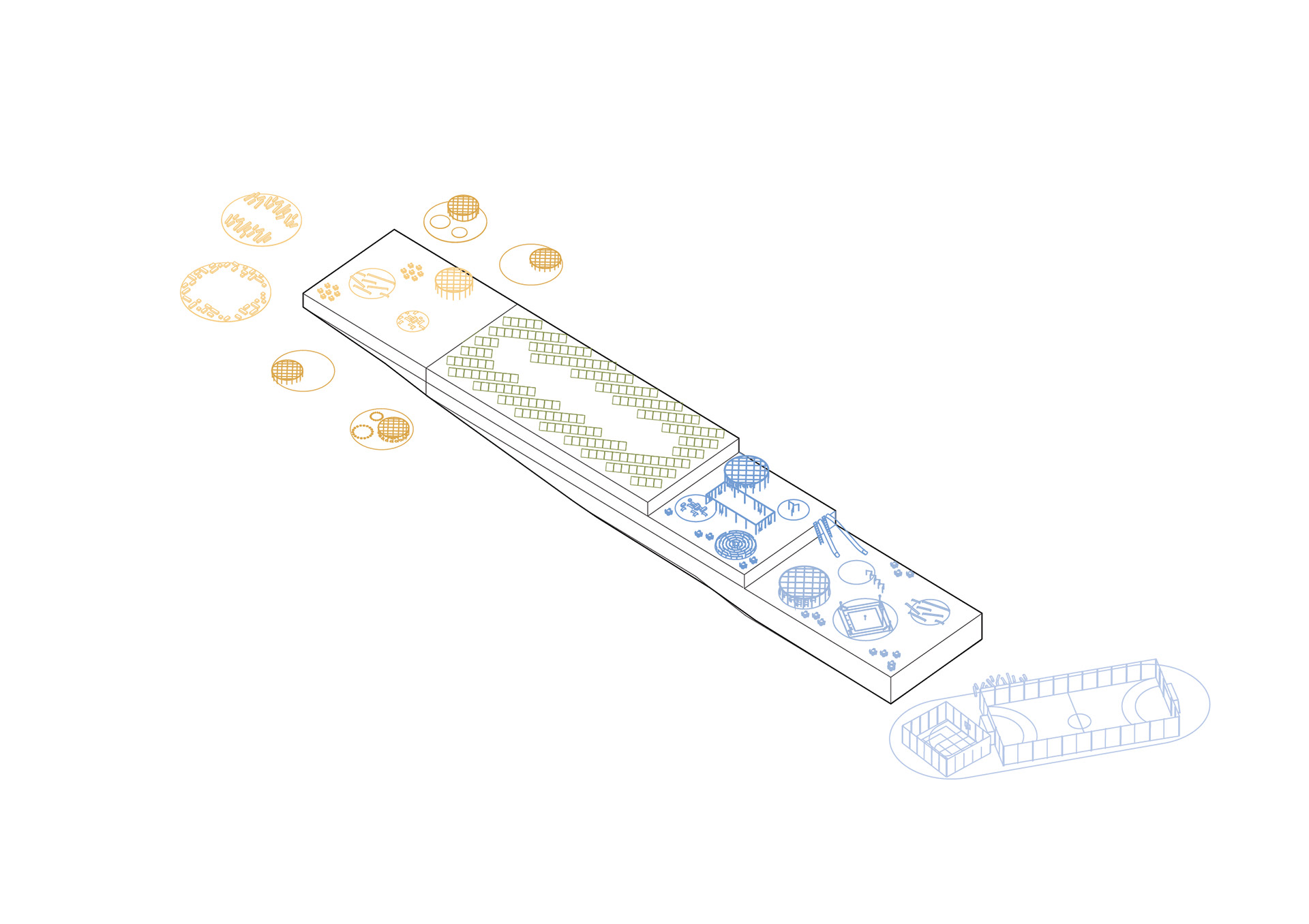 The architectural solution at the same time is simple and childishly playful. Giant wooden blocks are placed on the relief, emphasizing its shape. Each block has its own purpose. The highest block is a blocked kindergarten with a first-grade school, followed by a second-grade school block. The lowest block combines all public functions such as: event hall, gym, swimming pool, workshops and is publicly available.