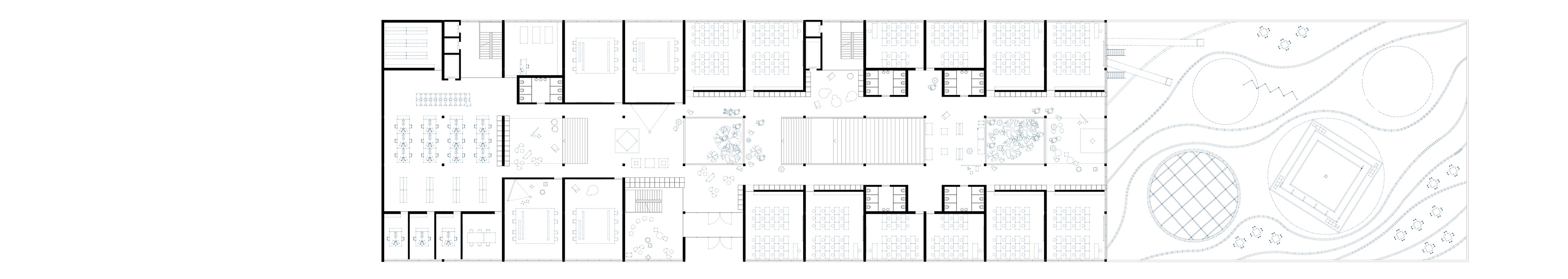 Внаслідок форми, що повторює наявний ландшафт природно утворюються великі тераси з доступом до них безпосередньо з будівлі. Кожен функціональний блок має відповідне розширення назовні. Для дитячого садка це серія невеликих плато серед дерев, окреме для кожної групи, а також, спортивний майданчик і сад. Школа першого та другого ступенів мають свої тераси відповідно, що є важливою особливістю проєкту, адже надає можливість проводити час на свіжому повітрі під час перерви або після уроків, що сприяє фізичній активності та здоровому способу життя.